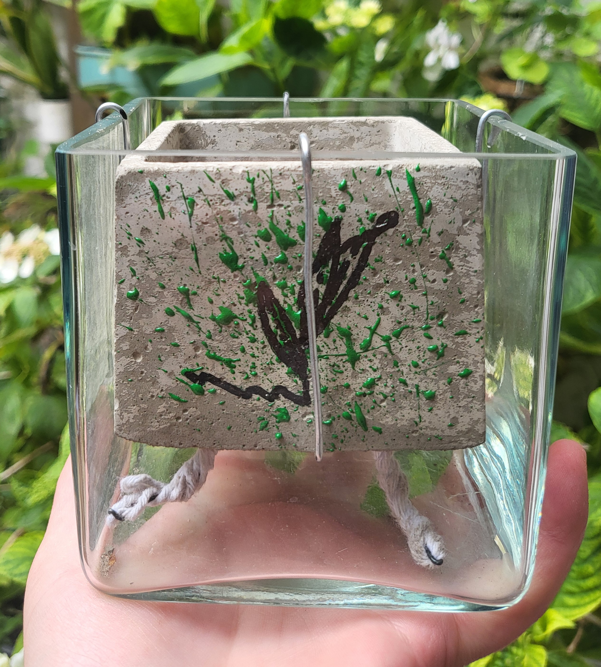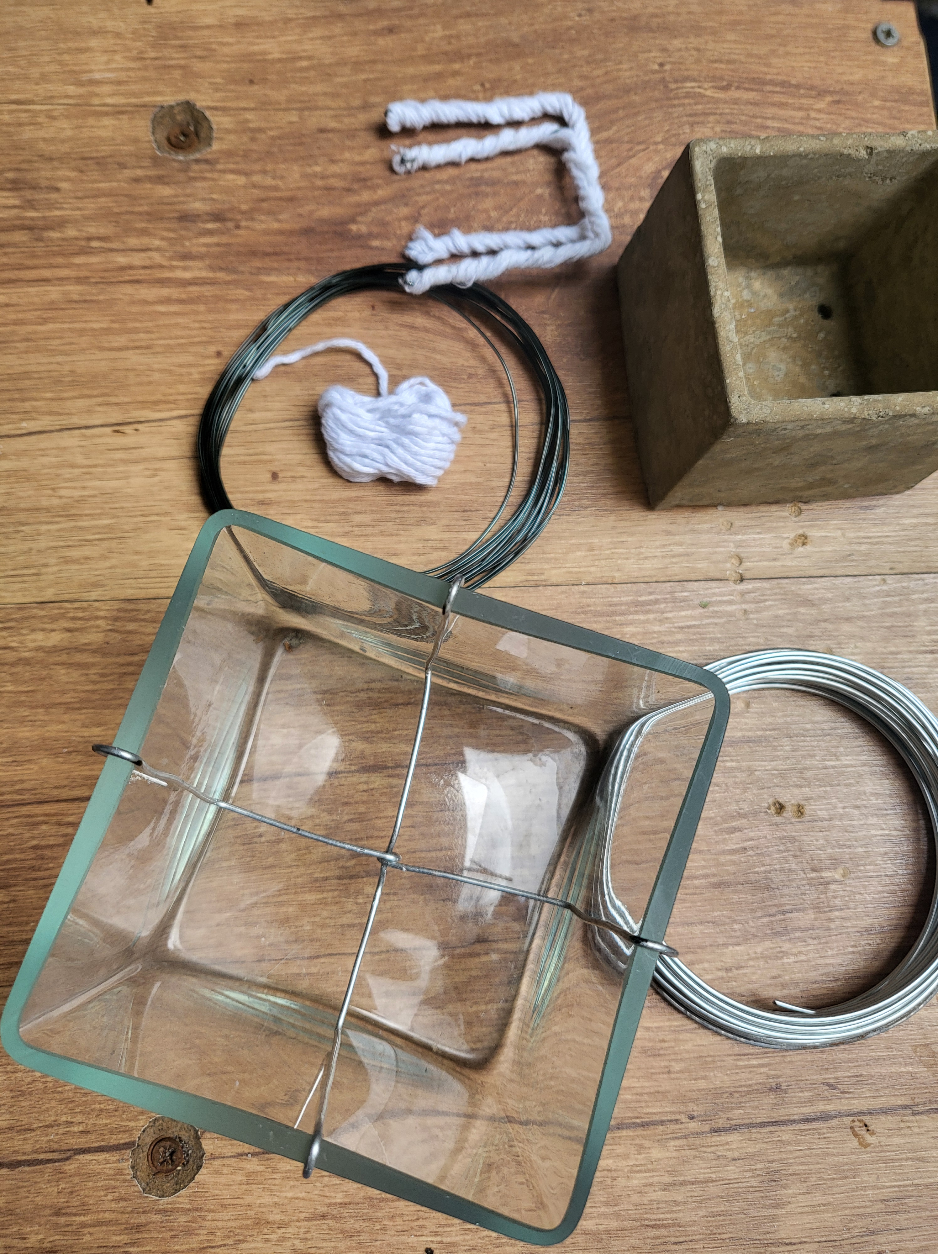 I had a glass square container, slightly bigger than my new cement planter. Although the planter looked very cute inside the glass container, I wanted to have it elevated, for the self-watering feature. To achieved this, I measured my planter, cut two pieces of garden wire and twisted them to create a support inside the glass container.
