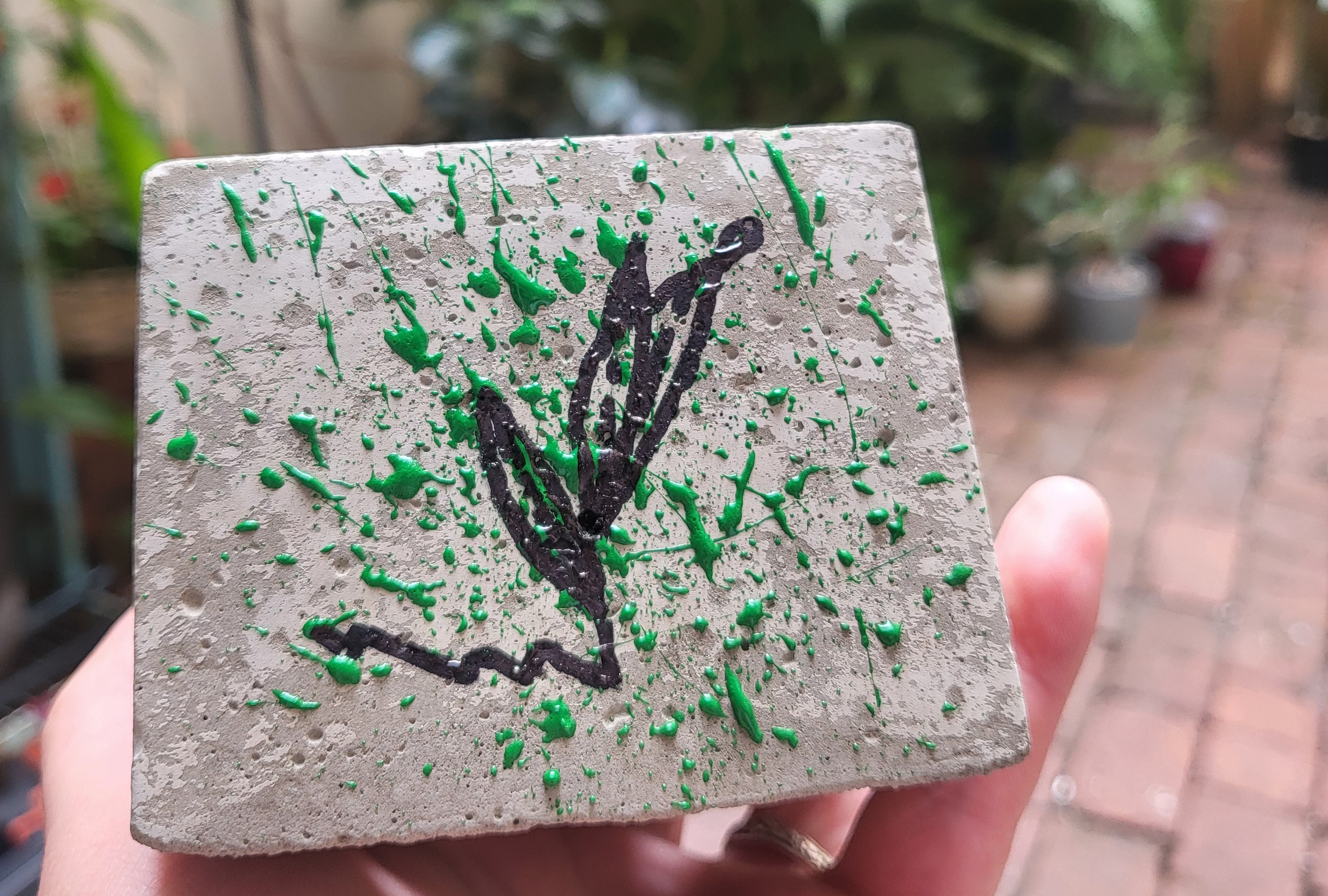 I bought the green paint in an attempt to replicate my logo on the planter. I made the leaves in my logo with black permanent marker, then I splashed some paint with a small brush and after drying, I drew the leaves again. This is definitely not a valuable piece of art, but it was so fun to create and added a bit of colour to the grey planter.