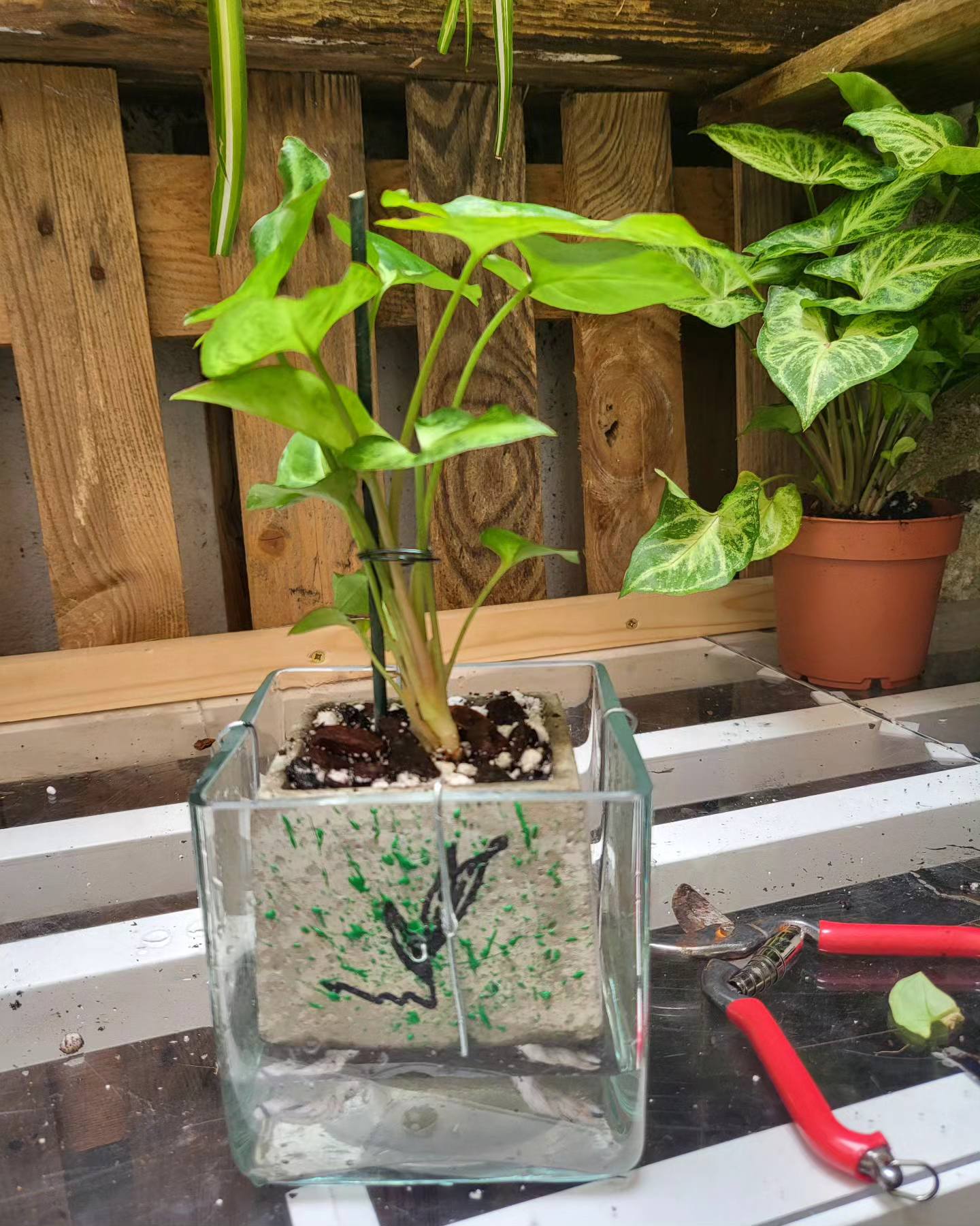 For this project I’ve chosen a Syngonium Batik baby plant that needs constant moist soil, but not waterlogged. Since the baby plant lost the support from the mother plant after I separated it, I added a bamboo stick to keep it erect until it will establish stronger roots.