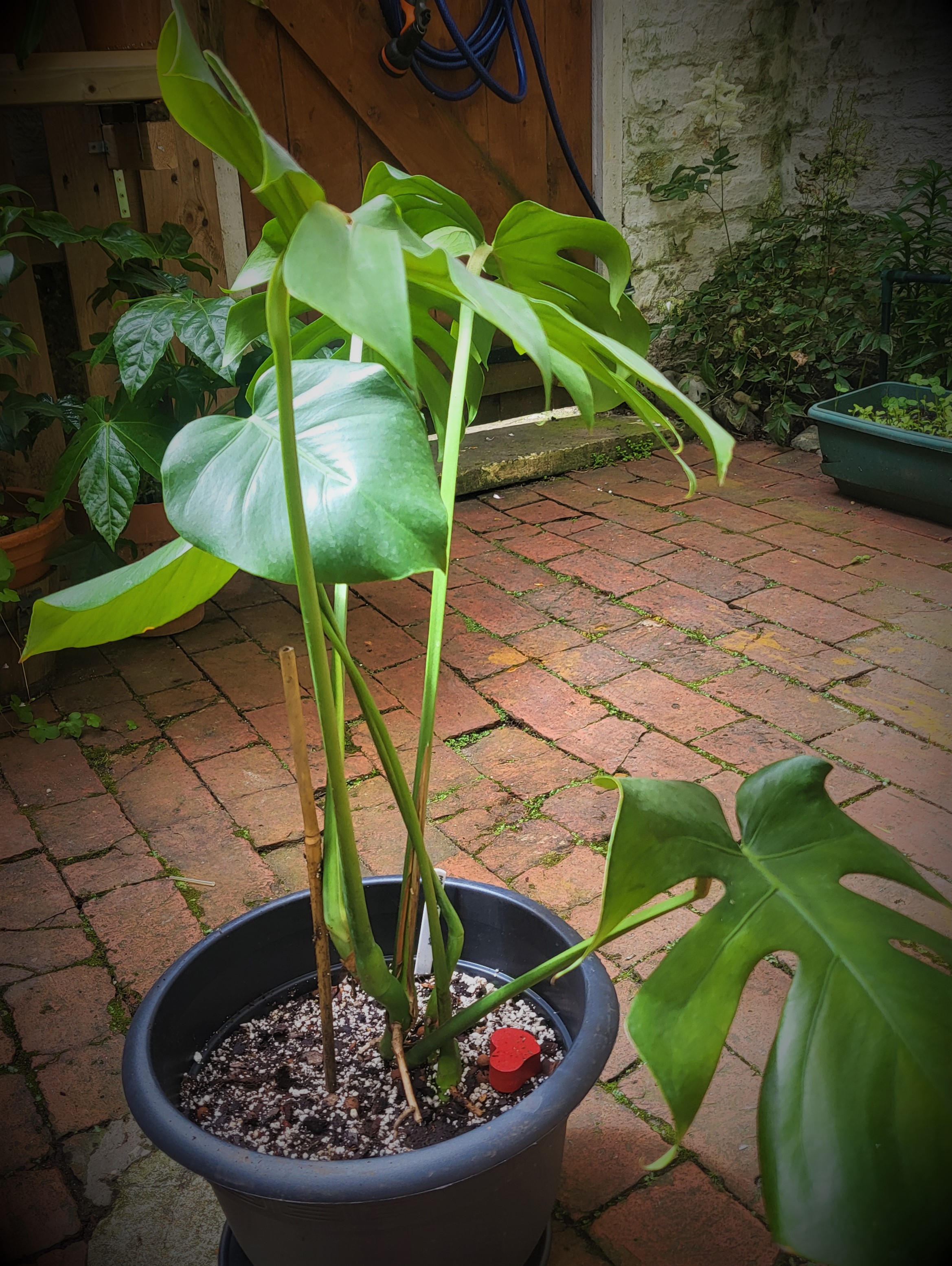 In my Green Monstera forest I have at least three emerging leaves at any given time, and even a double fenestration leaf. I am looking forward to seeing what new shape they will take.