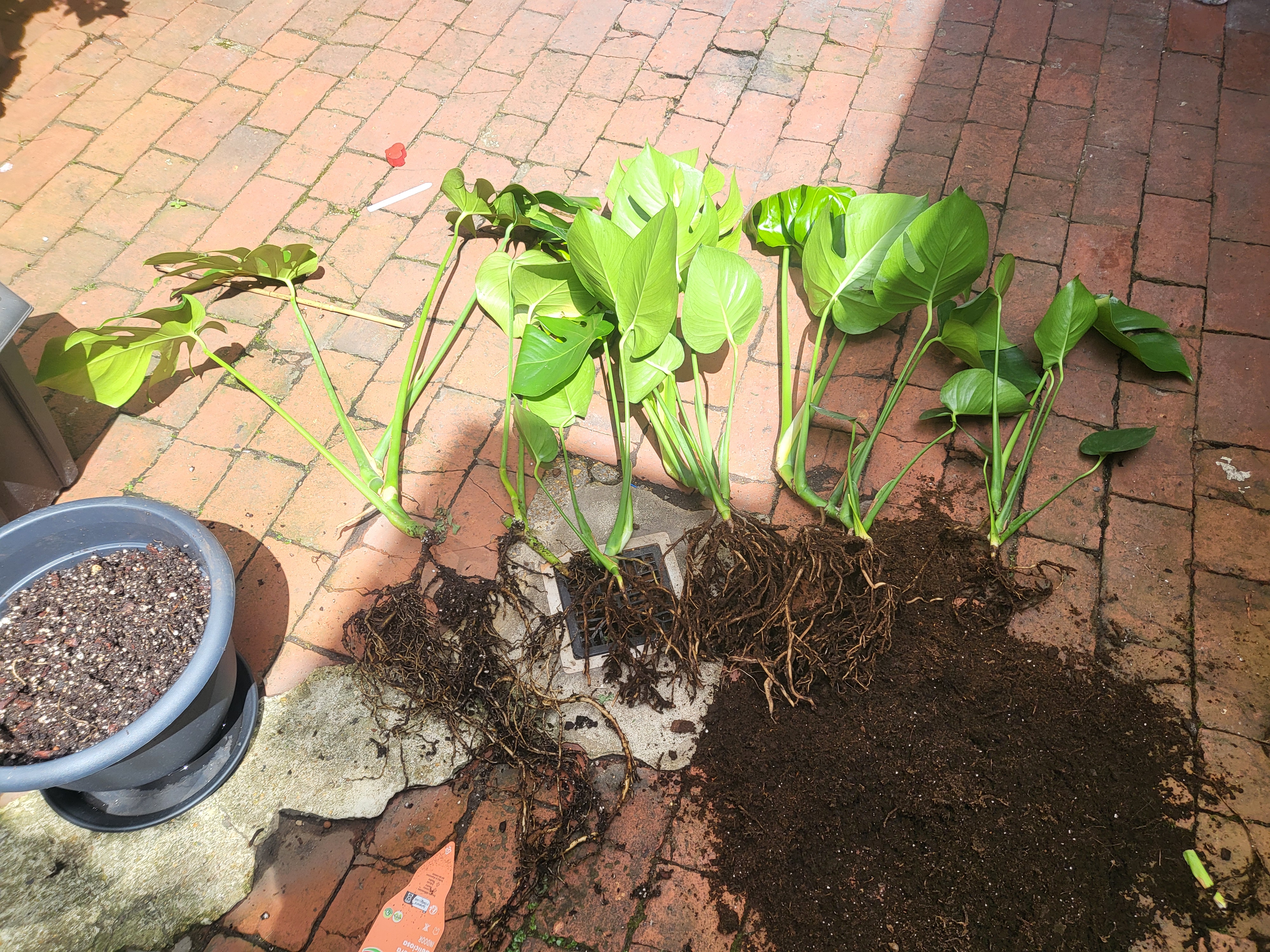 To my delight, my partner brought home two big Monsteras from a supermarket. After taking them out of the pots, I noticed many plants clumped in each pot, some of them very young. I figured the plants were grown from seeds with different germination times.