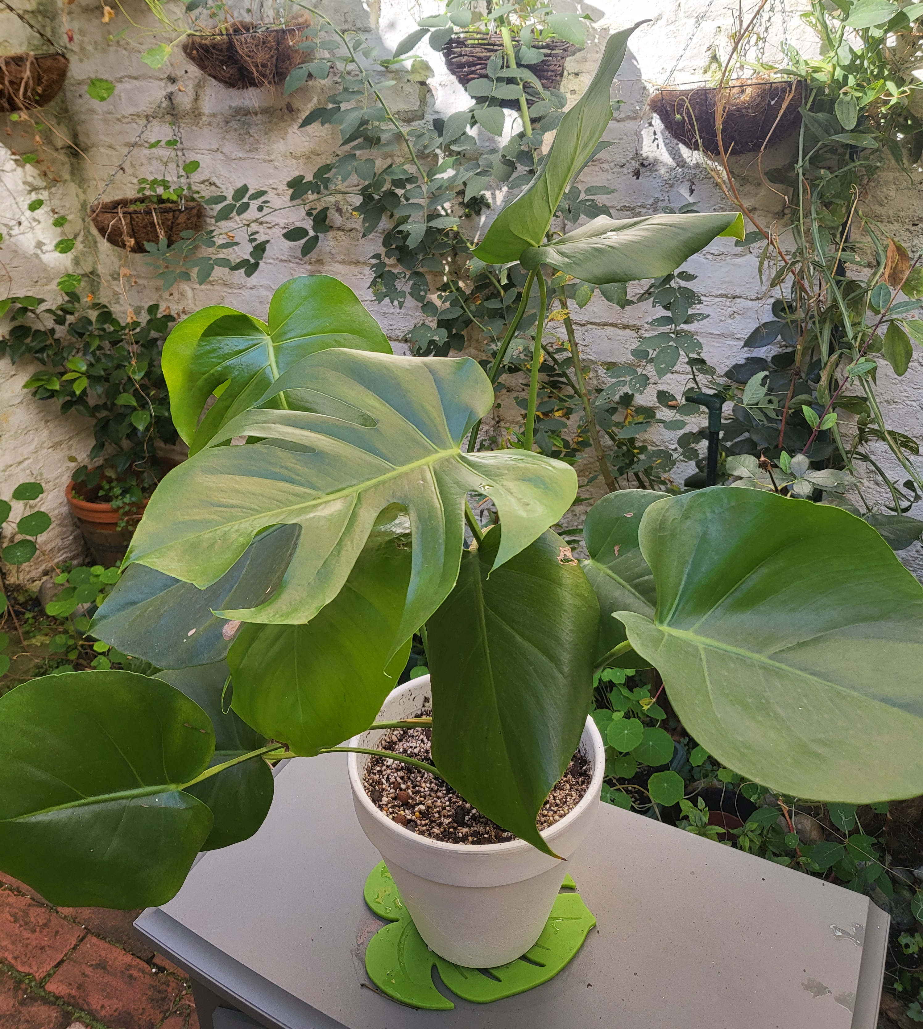 This is why I’ve got four Monstera Deliciosa young plants from my giant planter and repotted in a ceramic pot. Before that I’ve got into DIY a bit and painted the pot with a white spray paint. I added Green Monstera logo on the side and now it’s ready to go to a worthy cause. Naturally, I’ve used a simple aroid soil mix: compost, orchid bark and perlite.