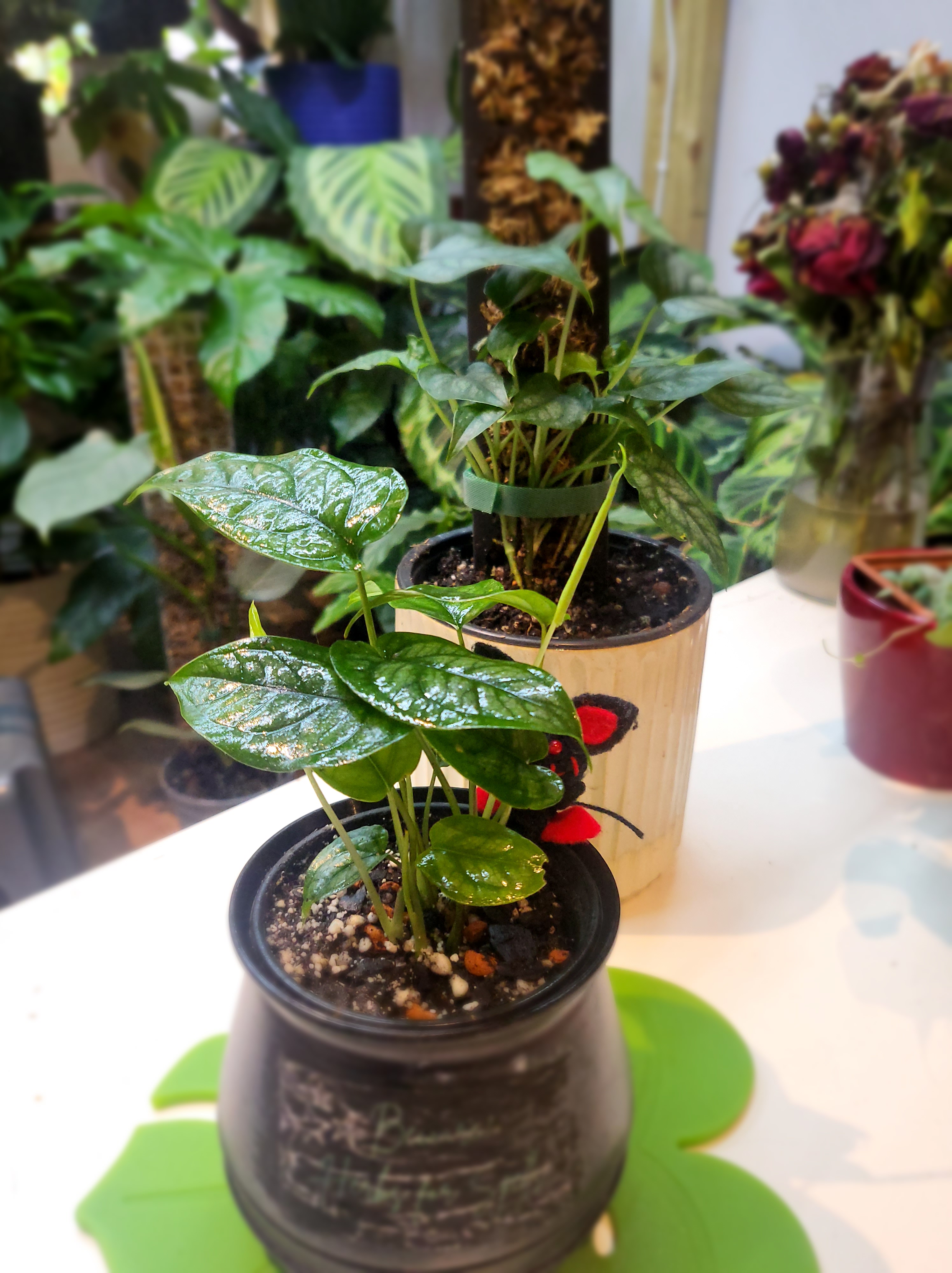 Nevertheless, I created a pot with more vines, and was left with a lot of baby plants, already rooted on the moss pole. Since last winter didn’t go into dormancy and kept growing, I’m confident it will get to a decent size in no time.