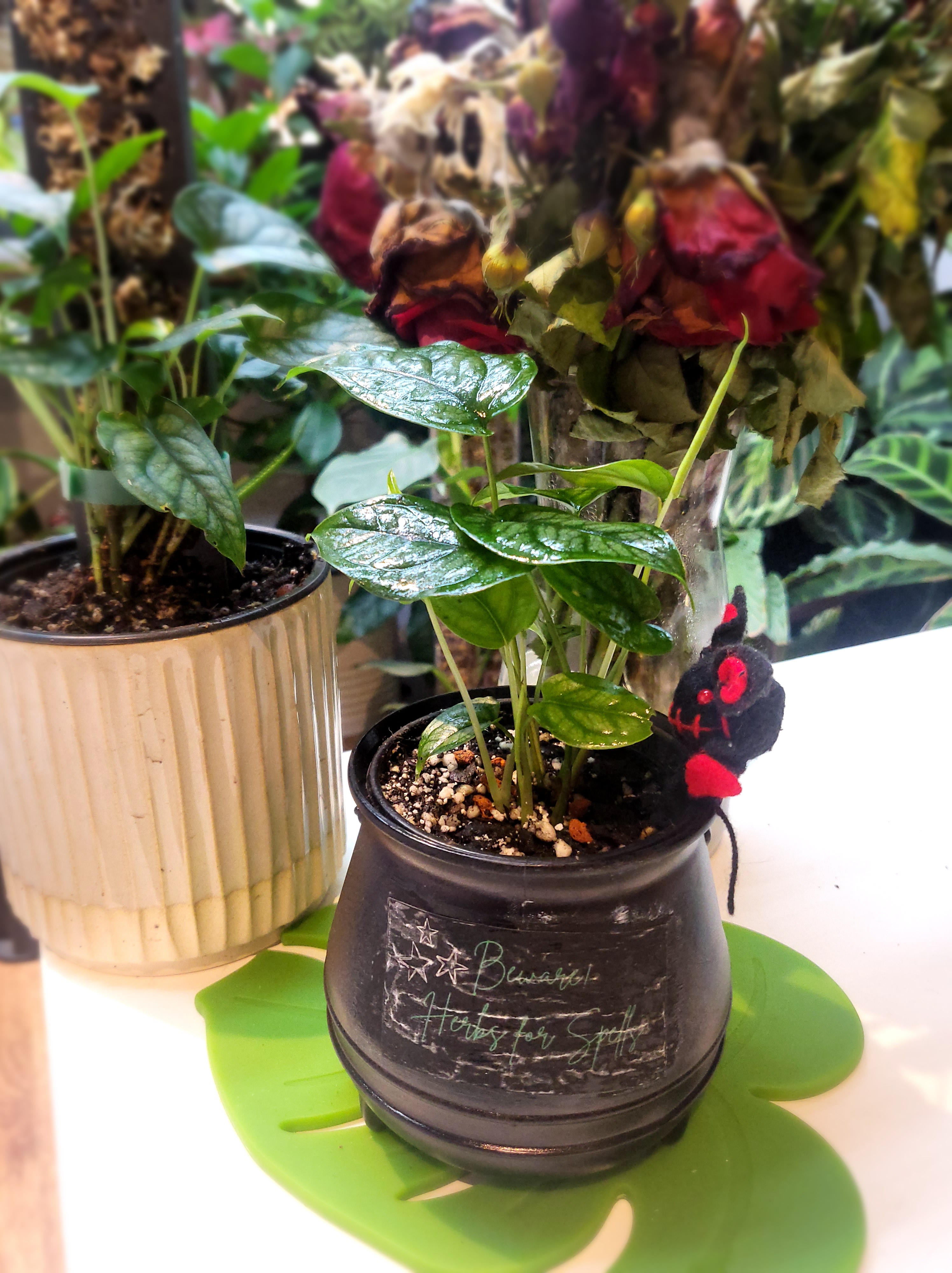 Some of the baby plants are growing in a tiny pot and made an appropriate choice for this Halloween promotion. Of course I dived a bit in DIY and repurposed a toy cauldron as a planter for a spooky vibe.