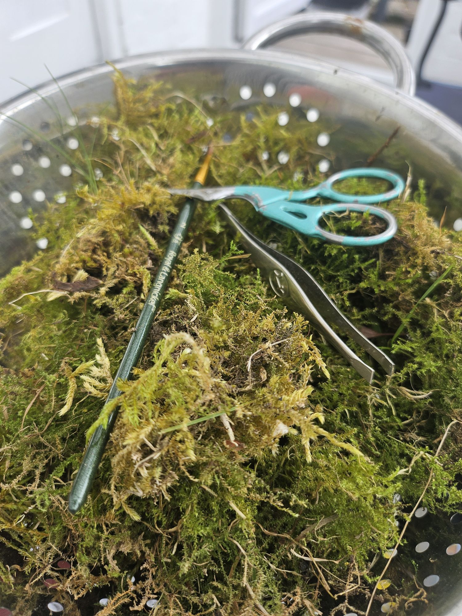 My new containers can’t really hold soil without being spilt all over the place when watered, and I considered using a mesh, but time was of the essence, and I didn’t have any available. Since my garden is a bit on the wild side, I have plenty of moss under the grass and was able to fill all the tiny spaces with moss, turning my containers into kokedamas.