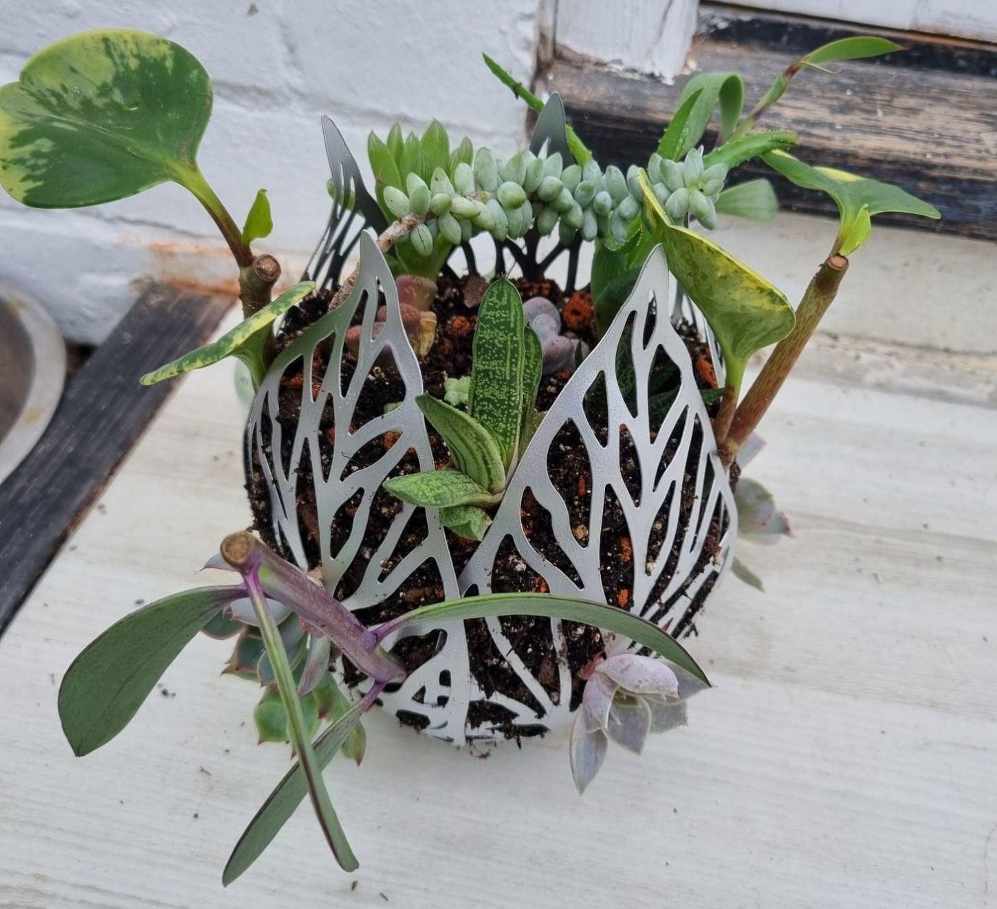 I spent an entire Saturday turning two balls of metal into succulent containers. I mixed a bit of soil adequate for succulents, sand, small pebbles, compost, perlite, and a bit of orchid bark. First, I added some soil, then added succulents through the holes in the metal until I filled the containers. Afterwards, I added fresh moss to keep the soil from drying very fast and give my containers a better look.